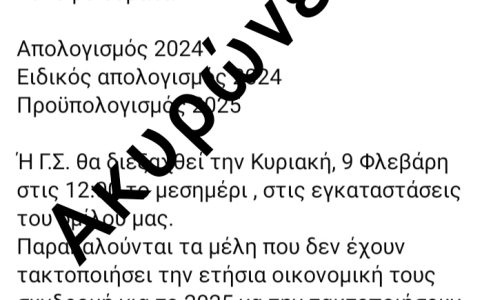 Λόγω της κατάστασης που επικρατεί στο νησί μας, η συνέλευση που ήταν προγραμματισμένη για την Κυριακή 9 Φεβρουαρίου ακυρώνεται.