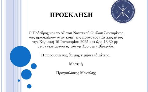 Ο πρόεδρος και το ΔΣ του Ναυτικού ομίλου Σαντορίνης σας προσκαλούν στην κοπή της πρωτοχρονιάτικης πίτας την Κυριακή 19/01/2025 και ώρα 13:30 μμ, στις εγκαταστάσ...