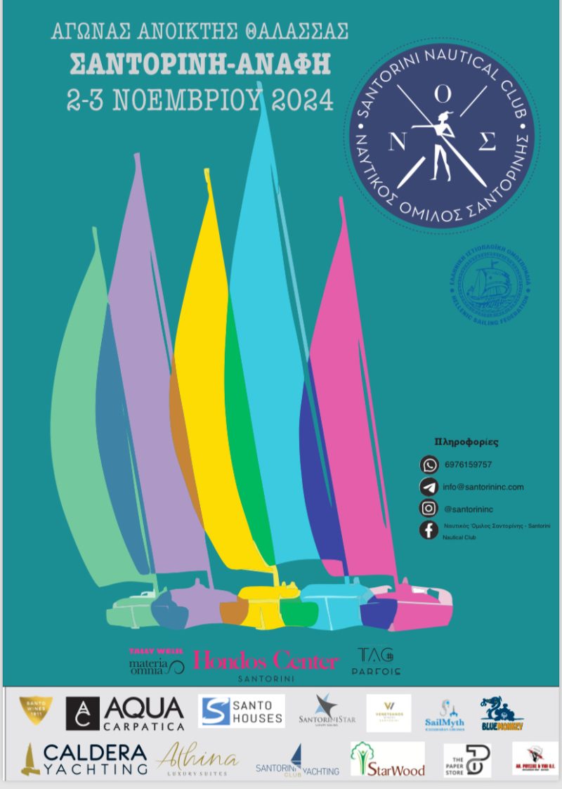 Ο Ναυτικός όμιλος Σαντορίνης προκηρύσσει διήμερο αγώνα ιστιοπλοΐας ανοικτής θαλάσσης, “Σαντορίνη – Ανάφη 2024”, το Σαββατοκύριακο 2 και 3 Νοεμβρίου, στη θαλάσσια περιοχή Σαντορίνης Ανάφης. Πληροφορίες 6948175531