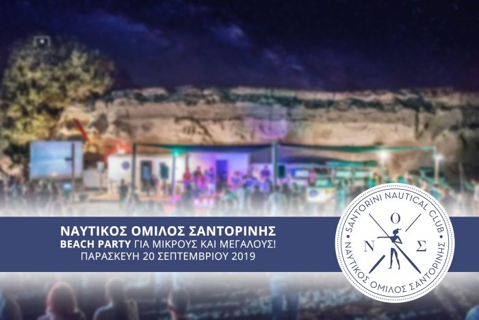 Ο Nαυτικός Όμιλος Σαντορίνης σας προσκαλεί στο Beach Party – Ετήσια εκδήλωση που θα πραγματοποιηθεί την Παρασκευή 20 Σεπτεμβρίου 2019, ώρα 19.00, στις εγκαταστάσεις του ομίλου στην παραλία της Bλυχάδας, δίπλα από το αλιευτικό καταφύγιο.