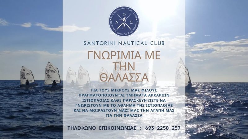 Ο Ναυτικός Όμιλος Σαντορίνης πραγματοποιεί δοκιμαστικό τμήμα αρχαρίων ιστιοπλοΐας ώστε να γνωριστούν η μικροί μας φίλοι με την τέχνη του αρμενίσματος και να μοιραστούν την αγάπη μας για το άθλημα της ιστιοπλοΐας και την θάλασσα.