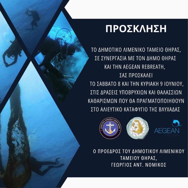 Ο Ναυτικός Όμιλος Σαντορίνης συμμετέχει και φέτος στις εκδηλώσεις του Δημοτικού Λιμενικού Ταμείου Θηρας με αφορμή την παγκόσμια ημέρα περιβάλλοντος και σας καλεί να συμμετέχετε μαζί και με την Aegean Rebreath στις δράσεις καθαρισμού του λιμανιού της Βλυχάδας το Σαββατοκύριακο 8-9 Ιουνίου 2024. Σας περιμένουμε, μικρούς και μεγάλους να καθαρίσουμε μαζί το λιμανάκι των ψαράδων και τον όμιλο μας !