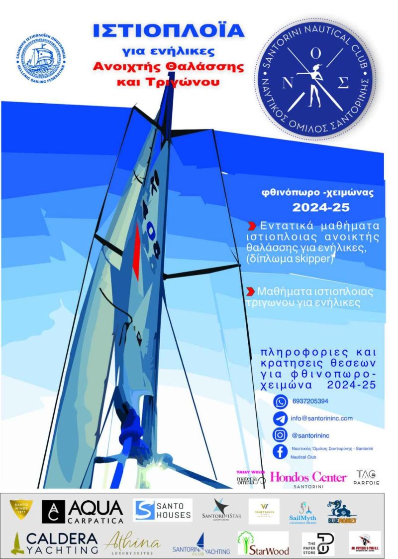 Η φθινοπωρινή σχολή ανοικτής θαλάσσης που διοργανώνει κάθε χρόνο ο Ναυτικός Όμιλος Σαντορίνης, αναμένεται να ξεκινήσει στις 6 Νοεμβρίου. Περιλαμβάνει 8 θεωρητικά και 8 πρακτικά μαθήματα.